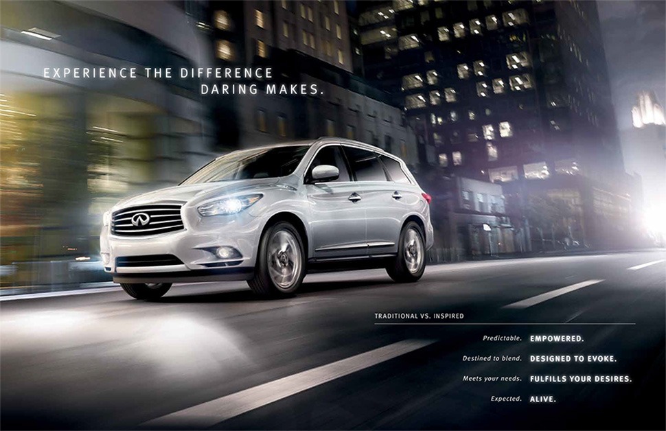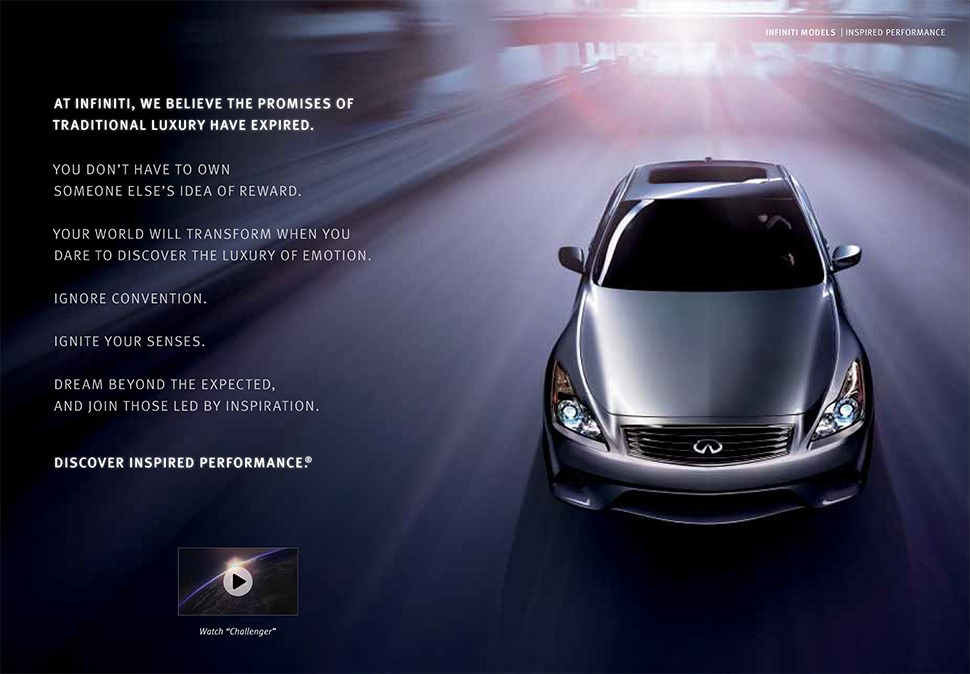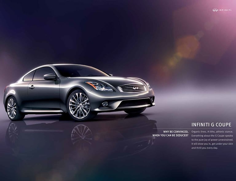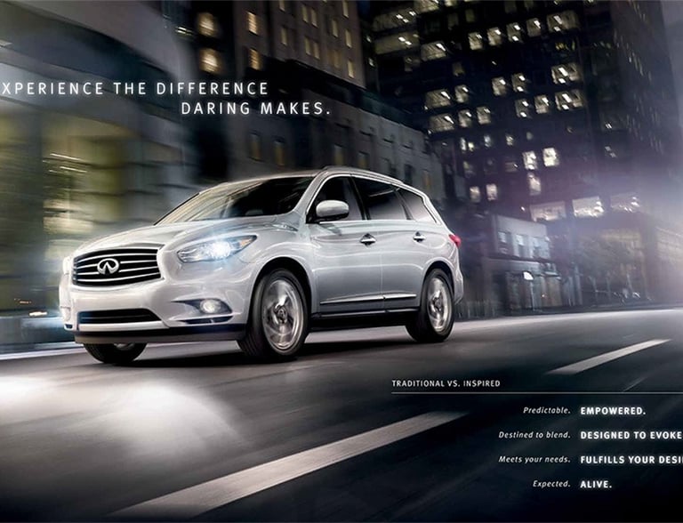 As a challenger luxury brand, Infiniti needed to make bold statements to establish itself. I crafted brand and product expressions for Infiniti during a critical period in its development. My work helped shift the positioning and elevate the brand from being "premium Nissans" to delivering a unique and identifiable luxury experience.