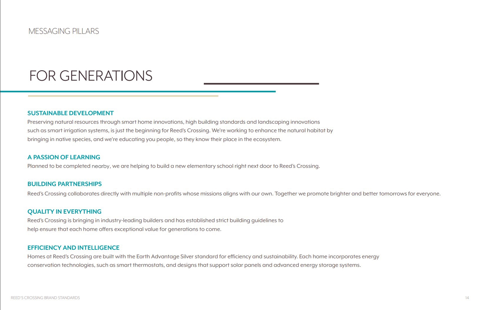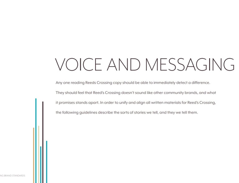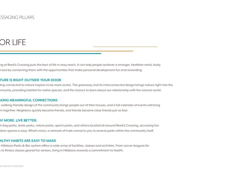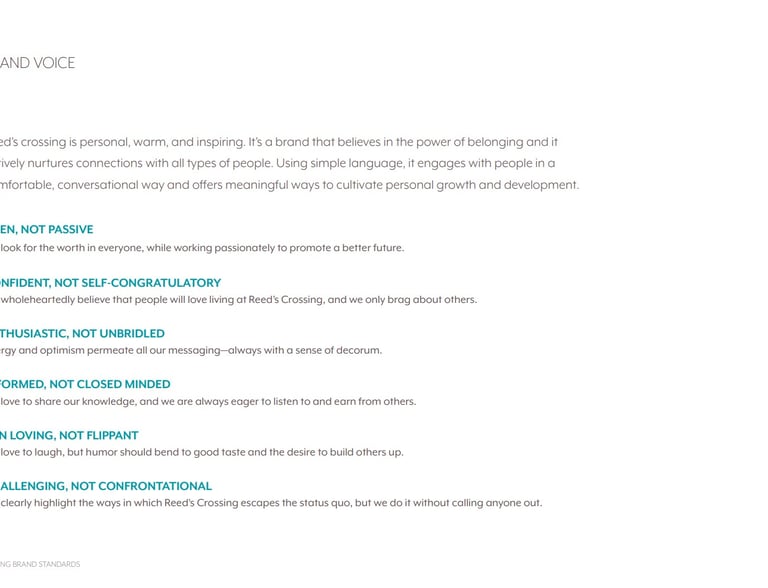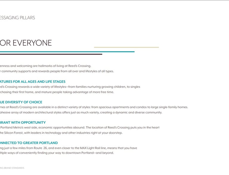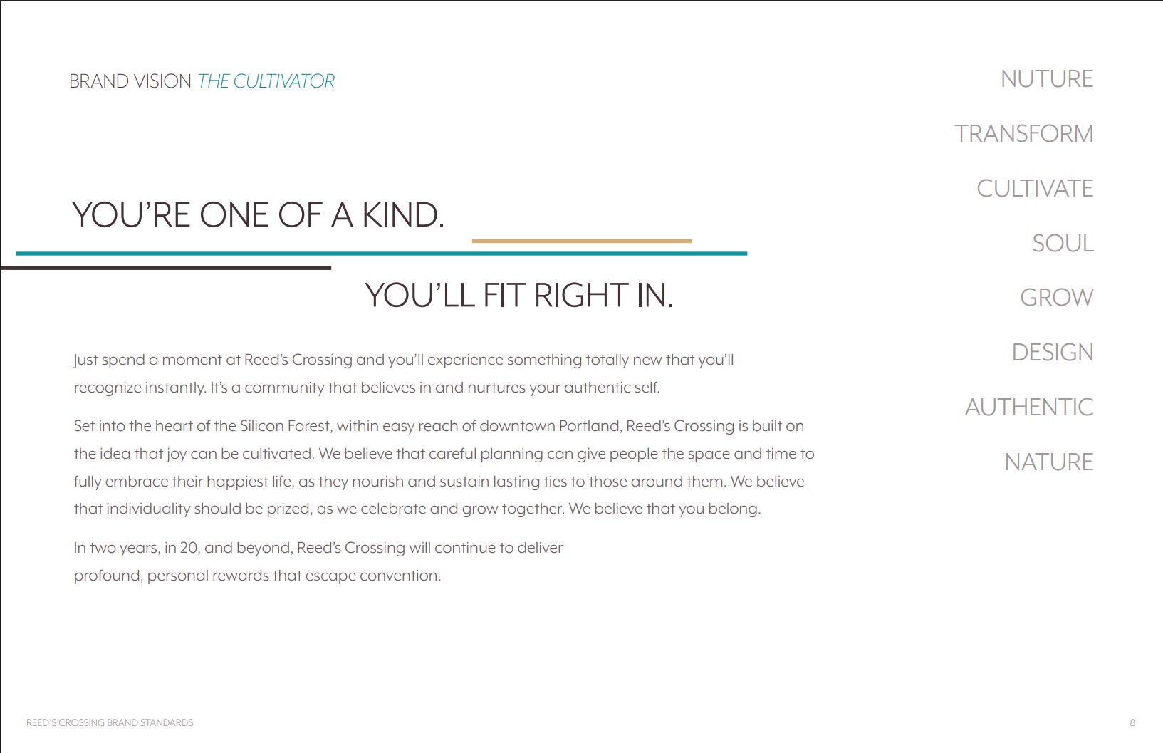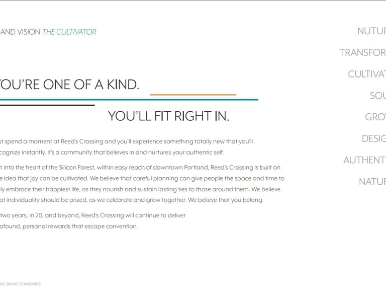 After an in-depth creative process, I captured the vision, voice, values and personality of a new community in this brand guide. I crafted a tagline which embodies the welcoming spirit that we wanted home buyers to experience: "You're one of a kind. You'll fit right in."