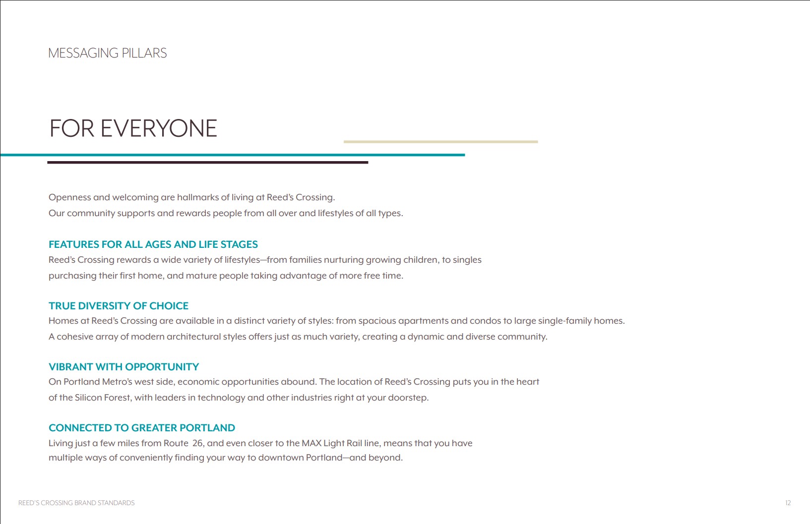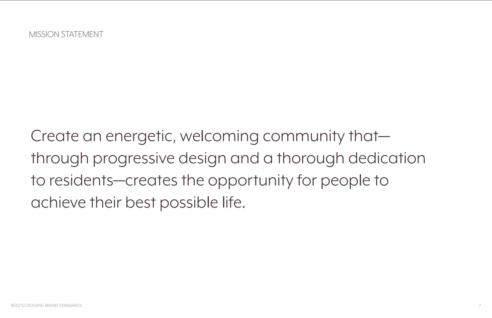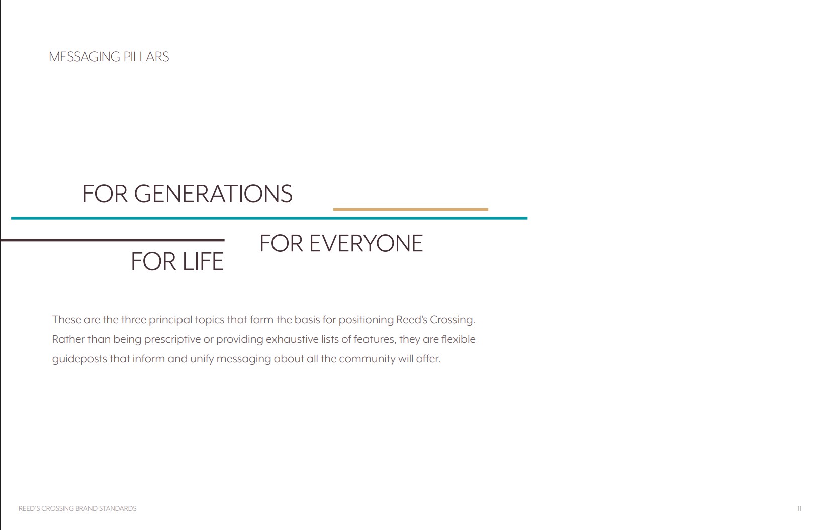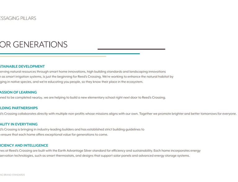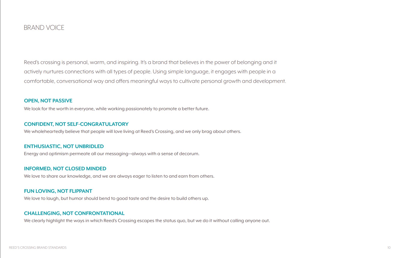 After an in-depth creative process, I captured the vision, voice, values and personality of a new community in this brand guide. I crafted a tagline which embodies the welcoming spirit that we wanted home buyers to experience: "You're one of a kind. You'll fit right in."